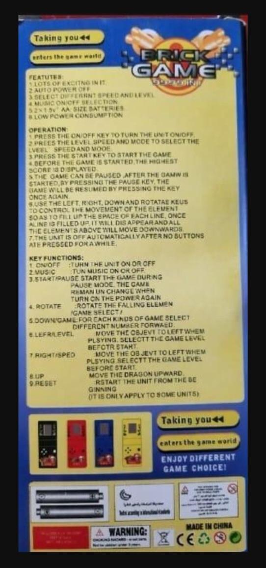 Game gift for Kids, Portable Video Game available in Different colors • Material: Plastic • Number Of Pieces: 1 Pc • Color: Multicolor • Package Includes: 1 x Portable Video Game • Portable Video Game available in Different colors • Note: Adult supervision is recommended as this toy may contain small parts that could pose a choking hazard. • Product Code: MZ1510200043BHCNHB