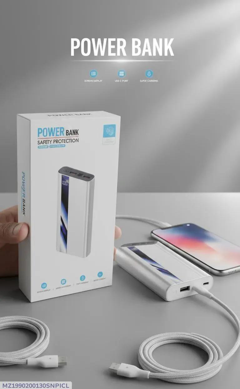 Portable Power Bank with Digital Display • Material: ABS Plastic • Connectivity Tech: USB • Charging Ports: 2 USB C + 1 USB A • Compatible Devices: For Laptops, Phones, And Tablets • Product Feature: Portable, Travel, Pocket-Size, Lightweight, Indicator Lights, Two Usb Ports, Slim, Flashlight, Compact • Color: White • Package Includes: 1 x Power Bank • Battery Capacity: 20000 mAh • Standby Time: 24 Hours • Weight: 800 Gram • Pack Of 1 • Screen Display (LED): It appears to have a digital screen (like the "100%" shown on the device itself) to display the remaining battery charge percentage. • USB-C Port: It includes a USB-C port, which is a modern, reversible standard used for both charging the power bank and charging other devices. • Super Charging: This indicates the power bank supports a fast-charging protocol, allowing compatible devices to charge quickly. • Safety Protection: The box explicitly mentions "SAFETY PROTECTION," suggesting it has built-in features to protect against issues like overcharging, over-discharging, short circuits, and overheating. • Design: The device has a sleek, metallic/silver finish. • Note: Please ensure to follow the instructions provided in the user manual for proper usage and safety precautions. • Product Code: MZ1990200130SNPICL Color : White